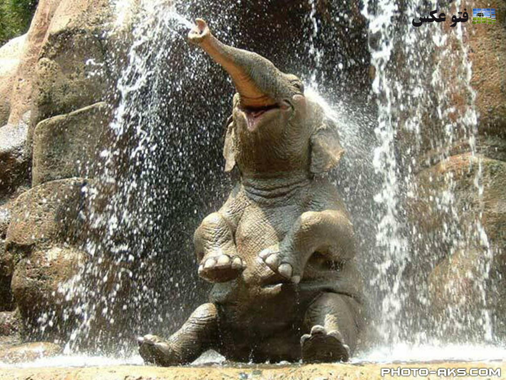 عکس زیبا و دوست داشتنی یک بچه فیل در ابشار مصنوعی پارک